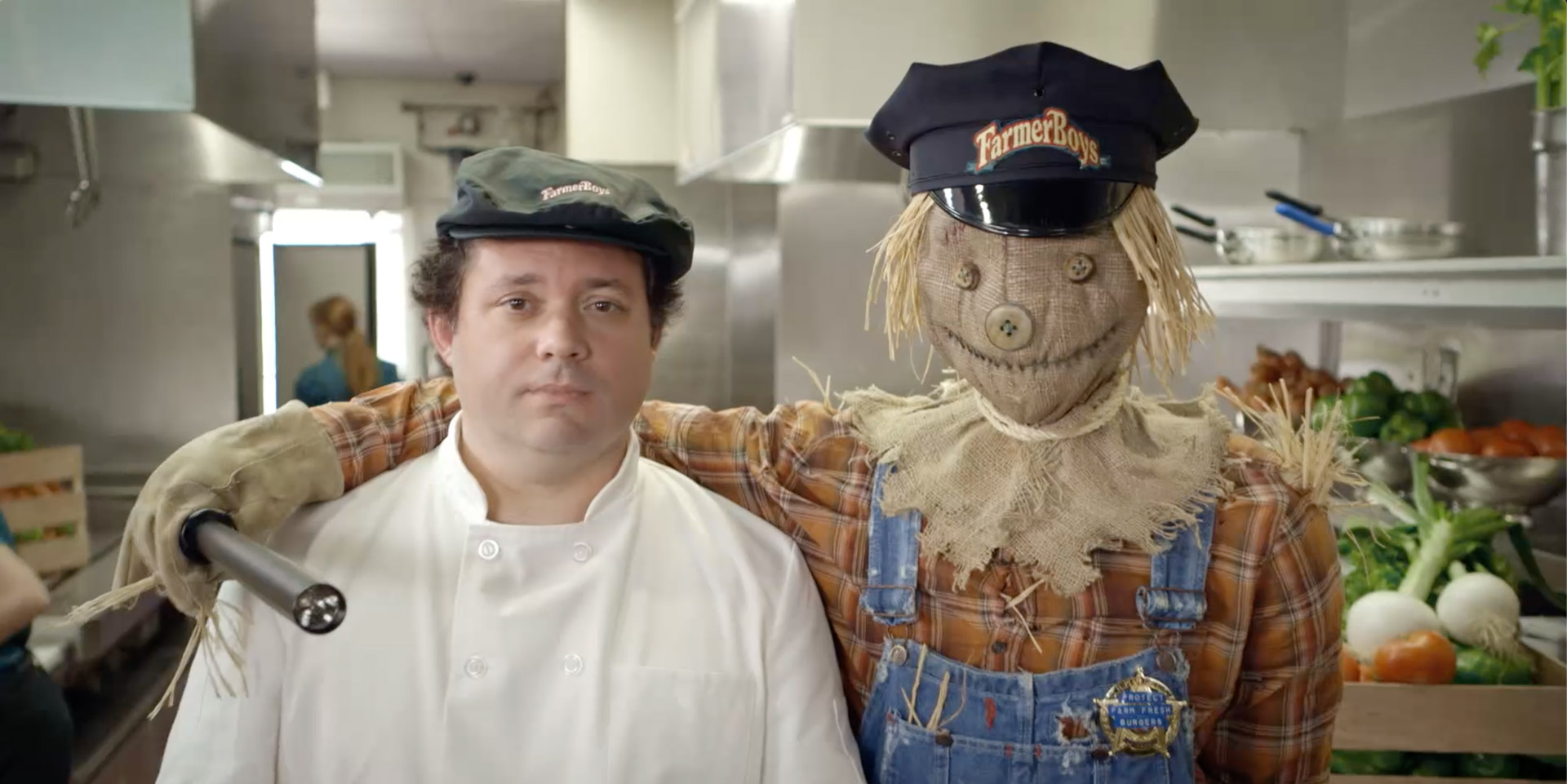 Suddenly the Scarecrow became alarmed! He was scared for the fresh produce at Farmer Boys. Who would protect it? What if crows found their way into a Farmer Boys restaurant? Those concerns would appear ridiculous to most folks, but as we all know, a Scarecrow lacks a brain. The Scarecrow hopped off his pole and hitched a ride to the nearest Farmer Boys where he was hired as the Head of Security.